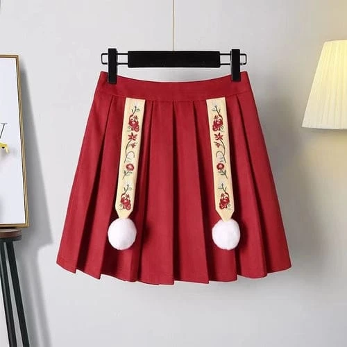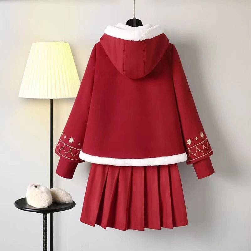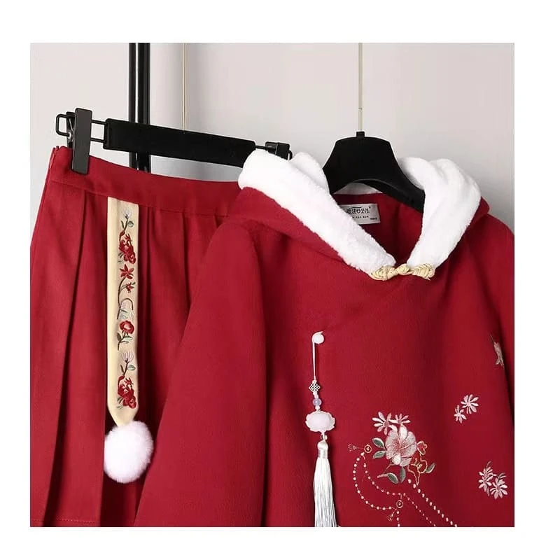 Cute Flowers Embroidery Vintage Hoodie and Skirt Red Set ON335