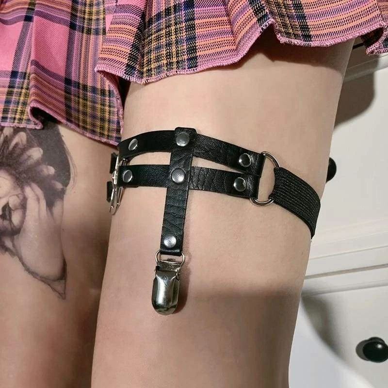 Enchanted Allure Pentagram Garter because no one can resist your magic. These vegan leather leg garter have a stretchy elastic backing, metallic garter clips and pentagram pendants on them.
