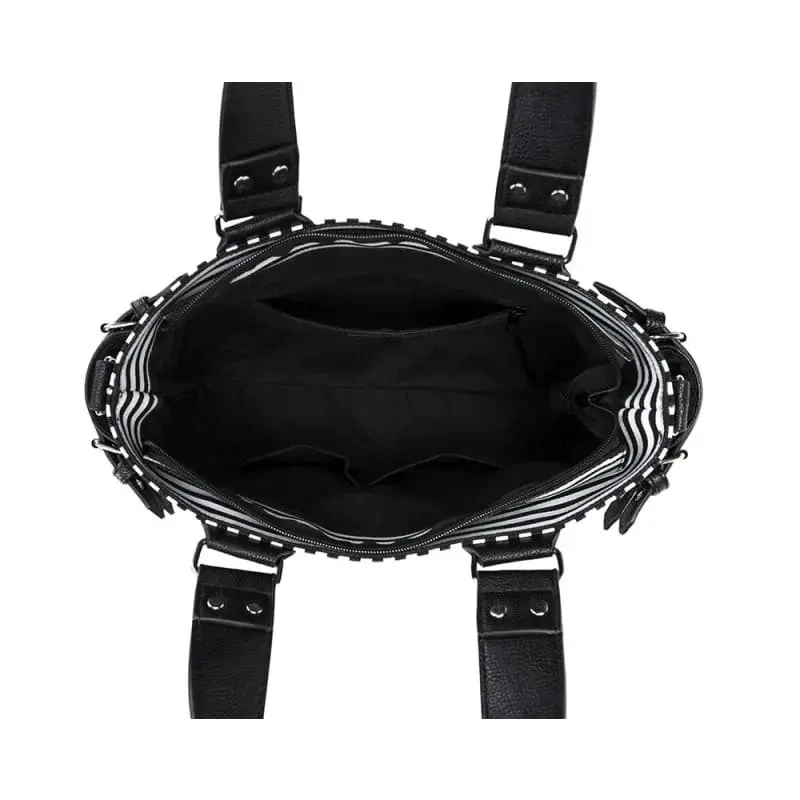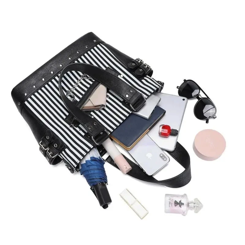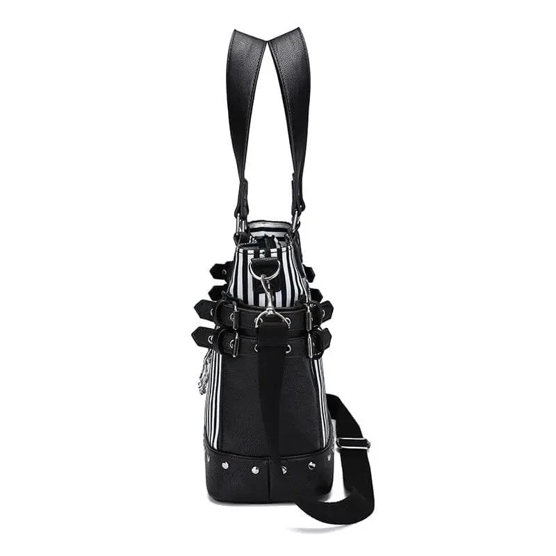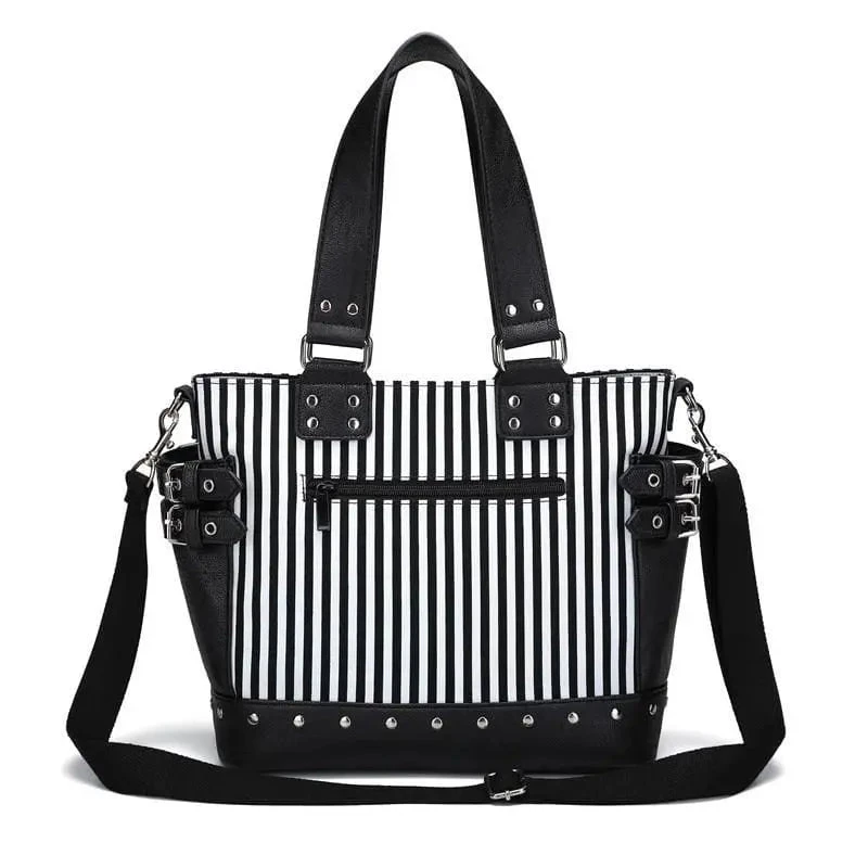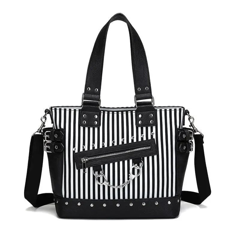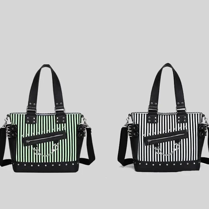 Gothic Black And White Stripes Studded Chain Zipper Tote Shoulder Bag EG089