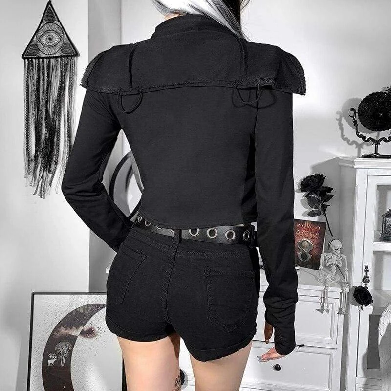 Chained N Masked Zipper Top. This top has protective face mask that can be opened into a regular top with a zipper closure, removable chains on the front and long sleeves with thumbholes.