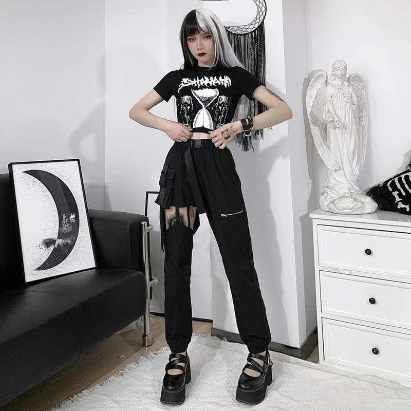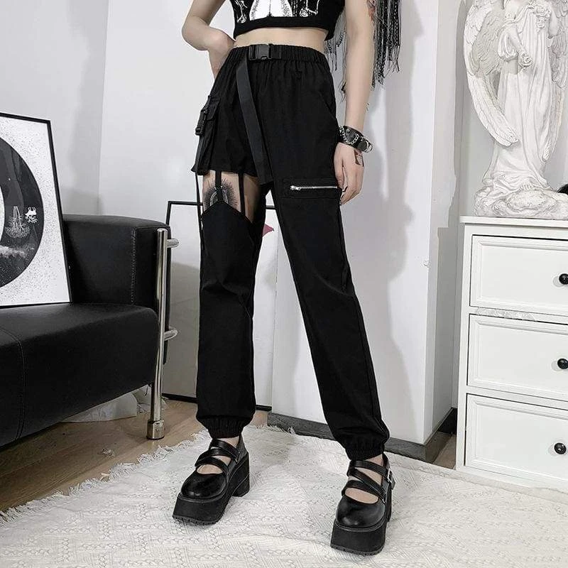 Chaos Cut-Out Cargo Pants have a high waist and a waistband, side cargo pocket, side zipper pocket and a cutout across the thigh with straps.