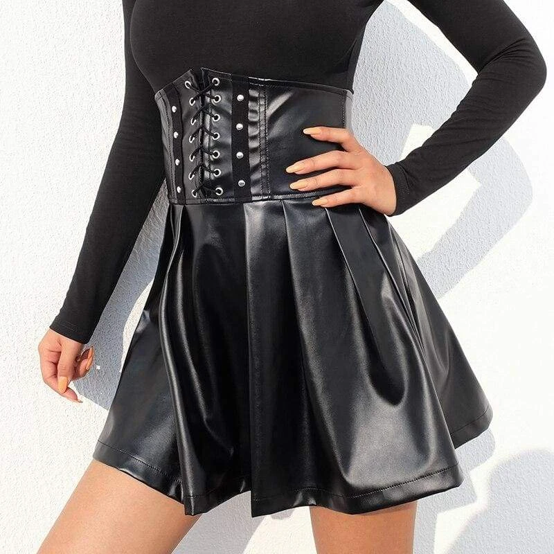 Fatally Obsessed Corset Skirt got them going divin’ right into you bb! Give them a lil tease wearing this wicked hot lace up skater skirt, black vegan leather construction and a fitted corset waist.