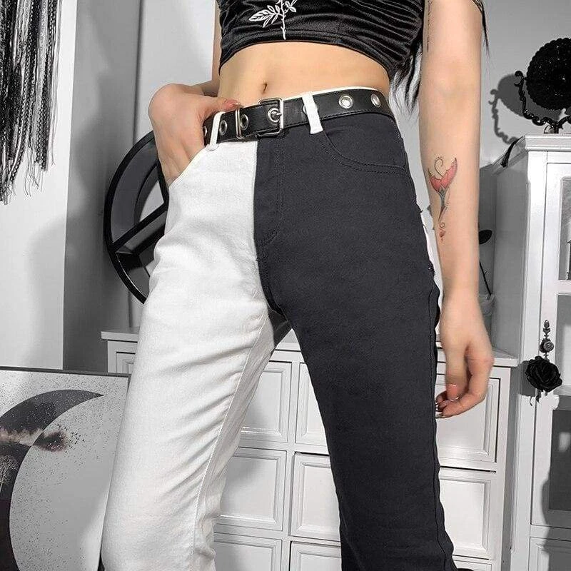 Hands On Me Pants. These colorblock jeans has flare legs, a dope hands patchwork on the back, front and back pockets and a zip fly closure.