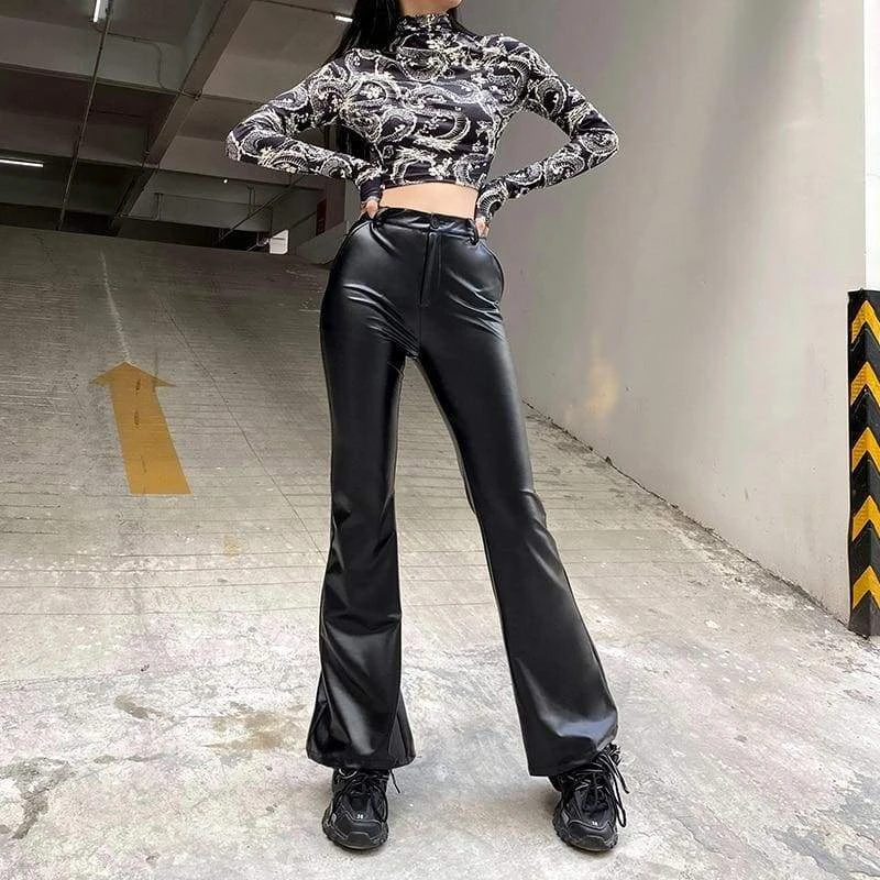 Impure Faux Leather Flare Pants cuz ya look like a sinister snack, babe. Keep it badazz in these flare pants that have a supa high waist, a zip fly closure, and ultra snug fit.