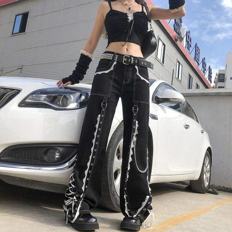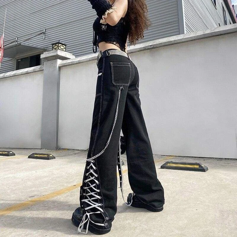 Lace Me Up Pants. These bondange-style pants have a flare leg mid rise fit, contrast top stitching, chains and bondages with eyelet detailing and side lace ups.