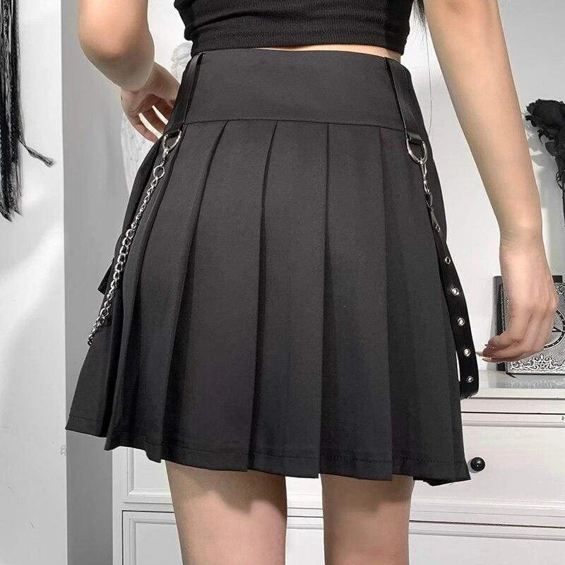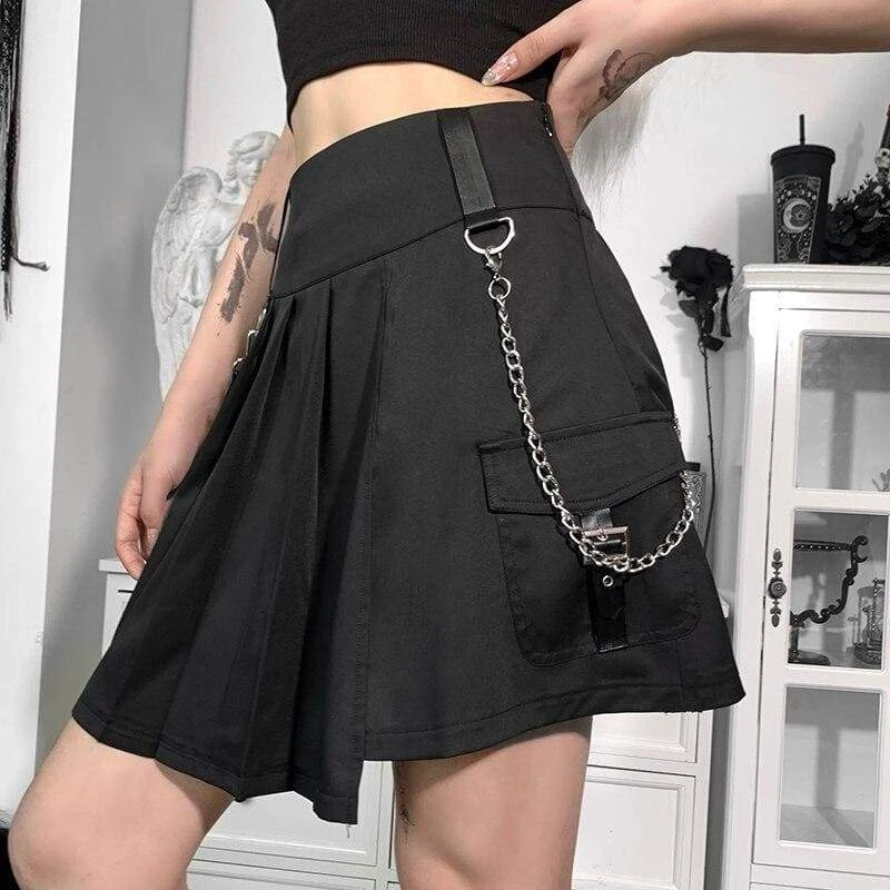 Ready For Action Pleated Skirt. This mini skirt has a pleated construction, a high waist fit, an hidden side zip closure, a side cargo pocket and detachable chain and strap with eyelets.