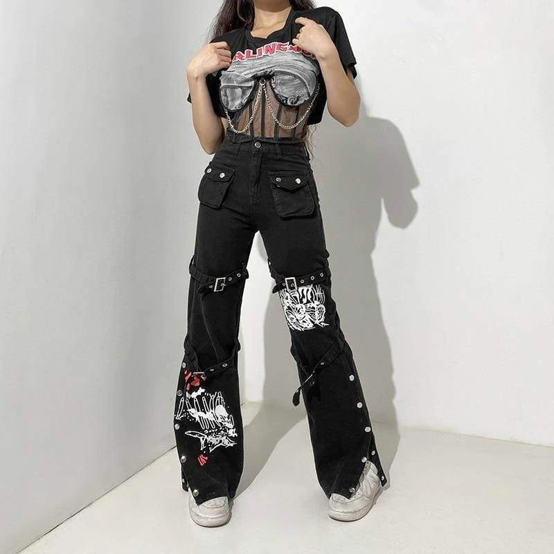 Rules To Break Buckle Pants. These straight leg pants have a sick graphics on the front, front and back pockets and bondage buckle straps on the legs.