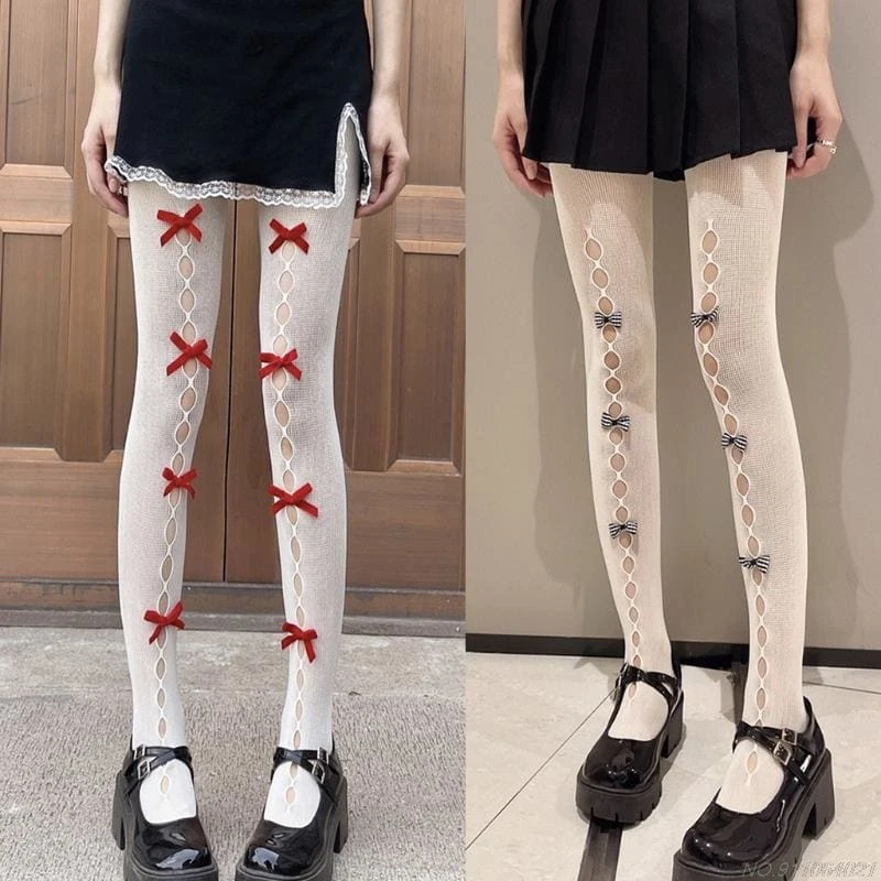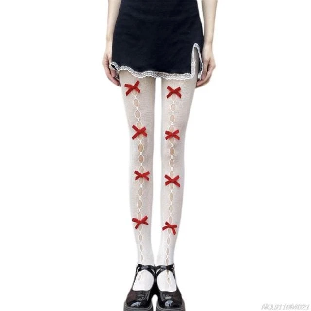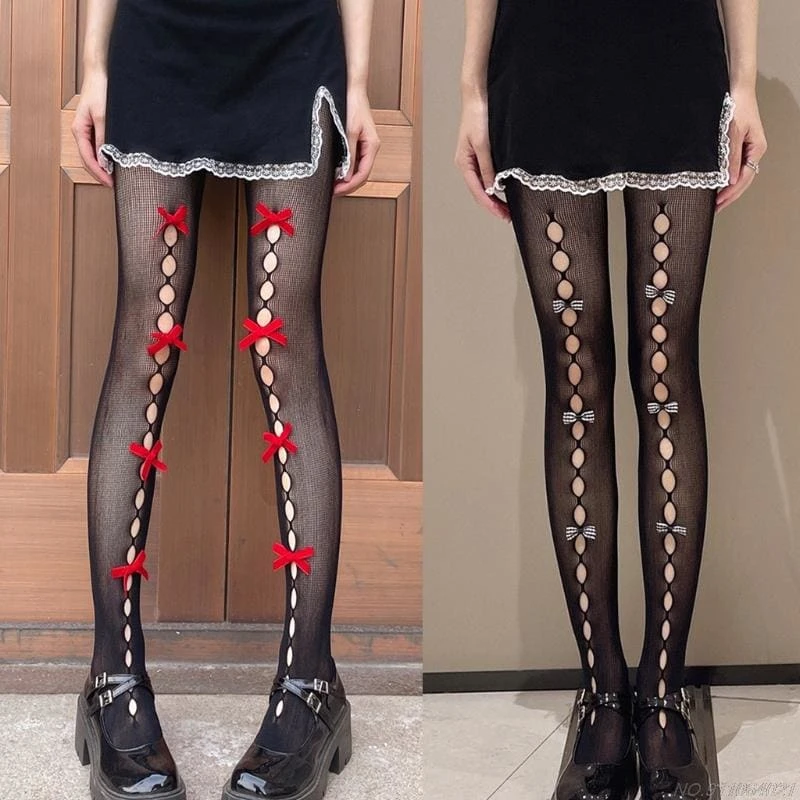 Kawaii Hollow Out Bowknot Black/White Lace Fishnet Tights BE480