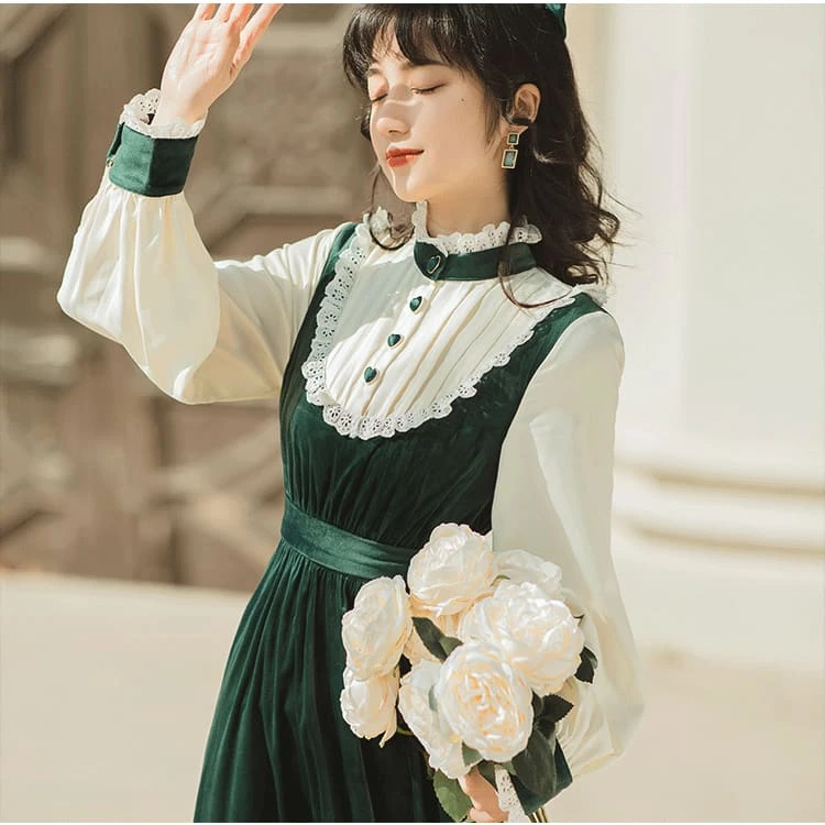 Palace Style Elegant Retro Cute Ruffled Stand-up Collar Green Dress BE439