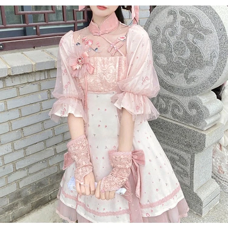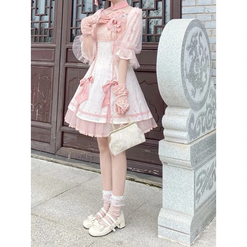 Peach Pink Qi Lolita Kawaii Embroidered Flowers Dress ON473