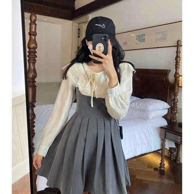 Preppy Style Kawaii Bow Lace Lovely Shirt Sweet Dress Set BE396