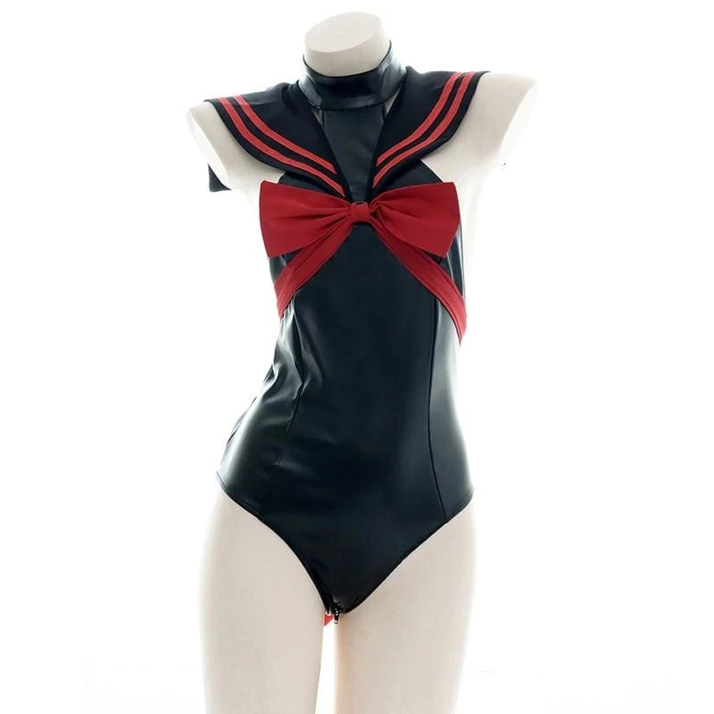 Punk Lolita PU Sailor Collar Turtleneck Bow Bandage Backless Bodysuits EG374