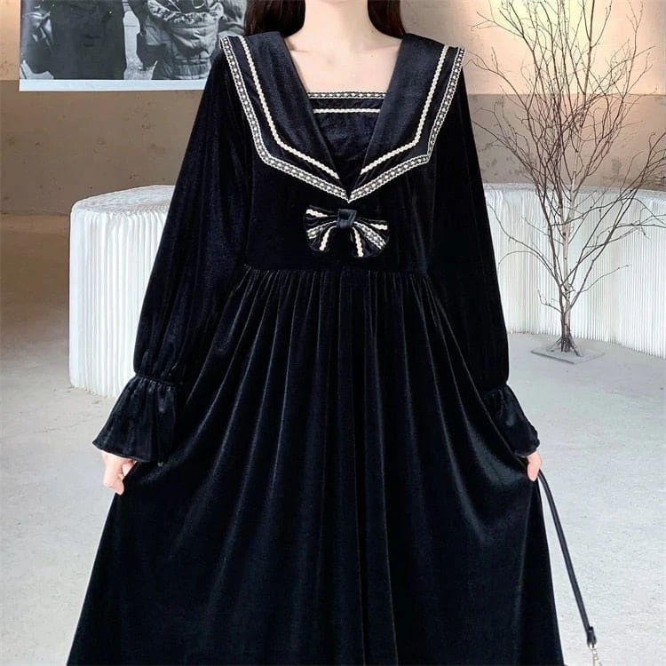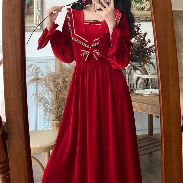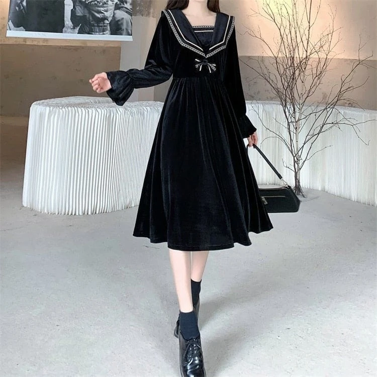 S-4XL Plus Size Black Red Long Sleeve Sweet Navy Collar Velvet Dress BE364