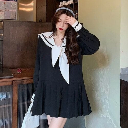 S-XL Plus Size Black/White Sailor Collar Bow Tie Pleated Sweet Dress BE380