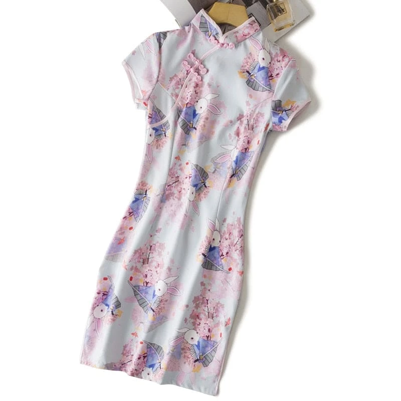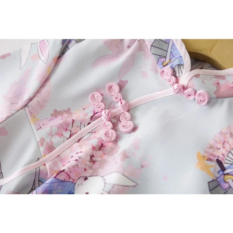 S-XXL Cute Anime Rabbit Cherry Blossom Pink Cheongsam Dress BE455