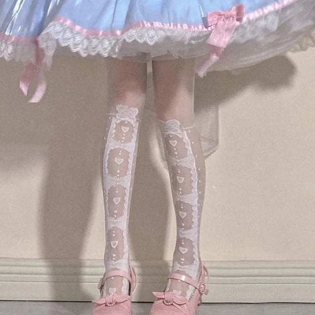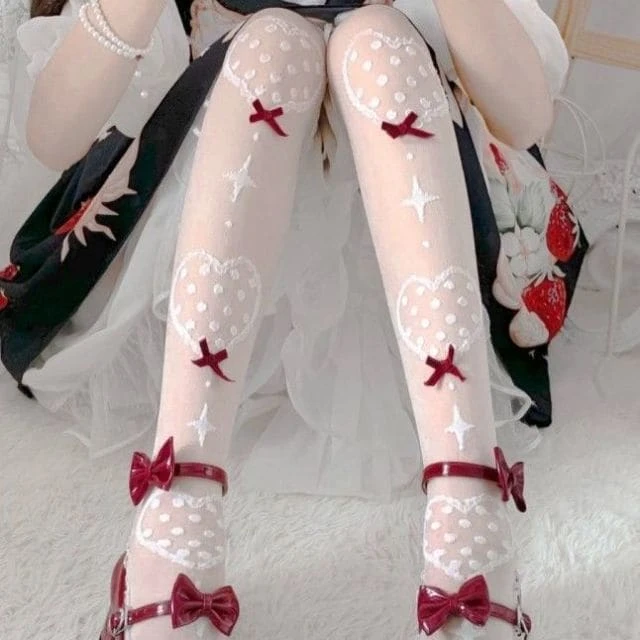 Sweet White/Black Print Kawaii Bow Lolita Over Knee Lace Stocking Tights BE477